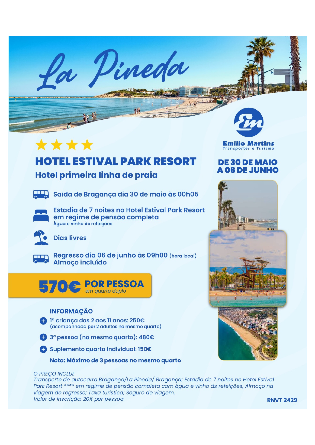 1ª criança dos 2 aos 11 anos: 250€ (acompanhada por 2 adultos no mesmo quarto)